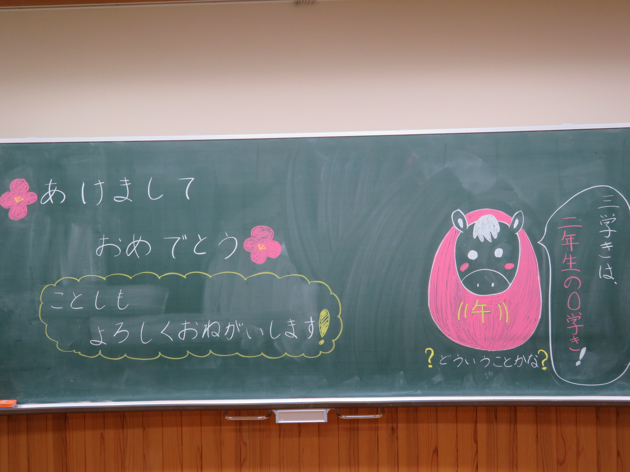 玄関ホールのウエルカムボードと、1年生教室 2年生教室の黒板です