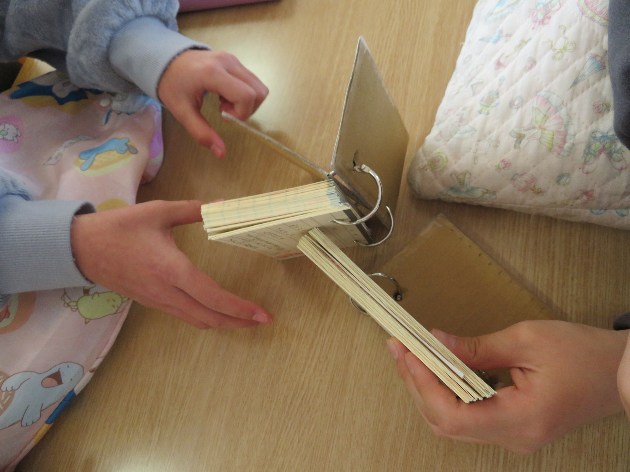 「見てください!今年一年でこんなに読みました!」と貸し出しカードを見せてくれる子たち。分厚い子は100冊以上です。
