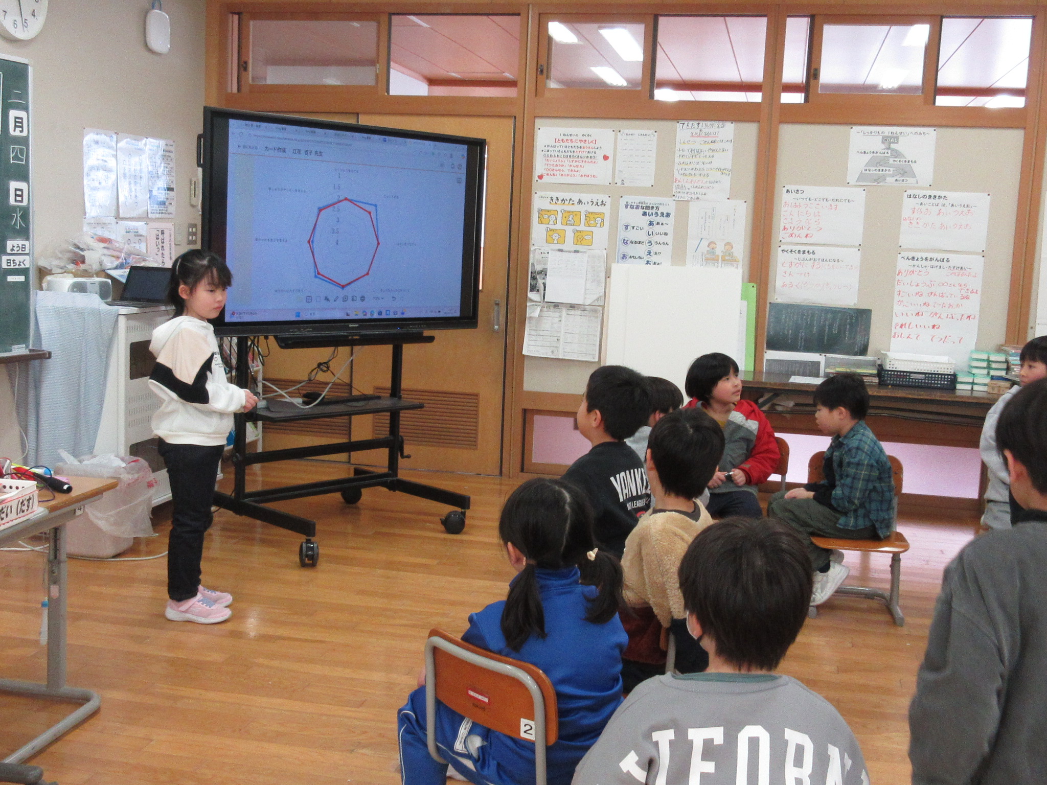 1年生が学級会で、学級目標の達成度やクラスの状態を振り返っていました。