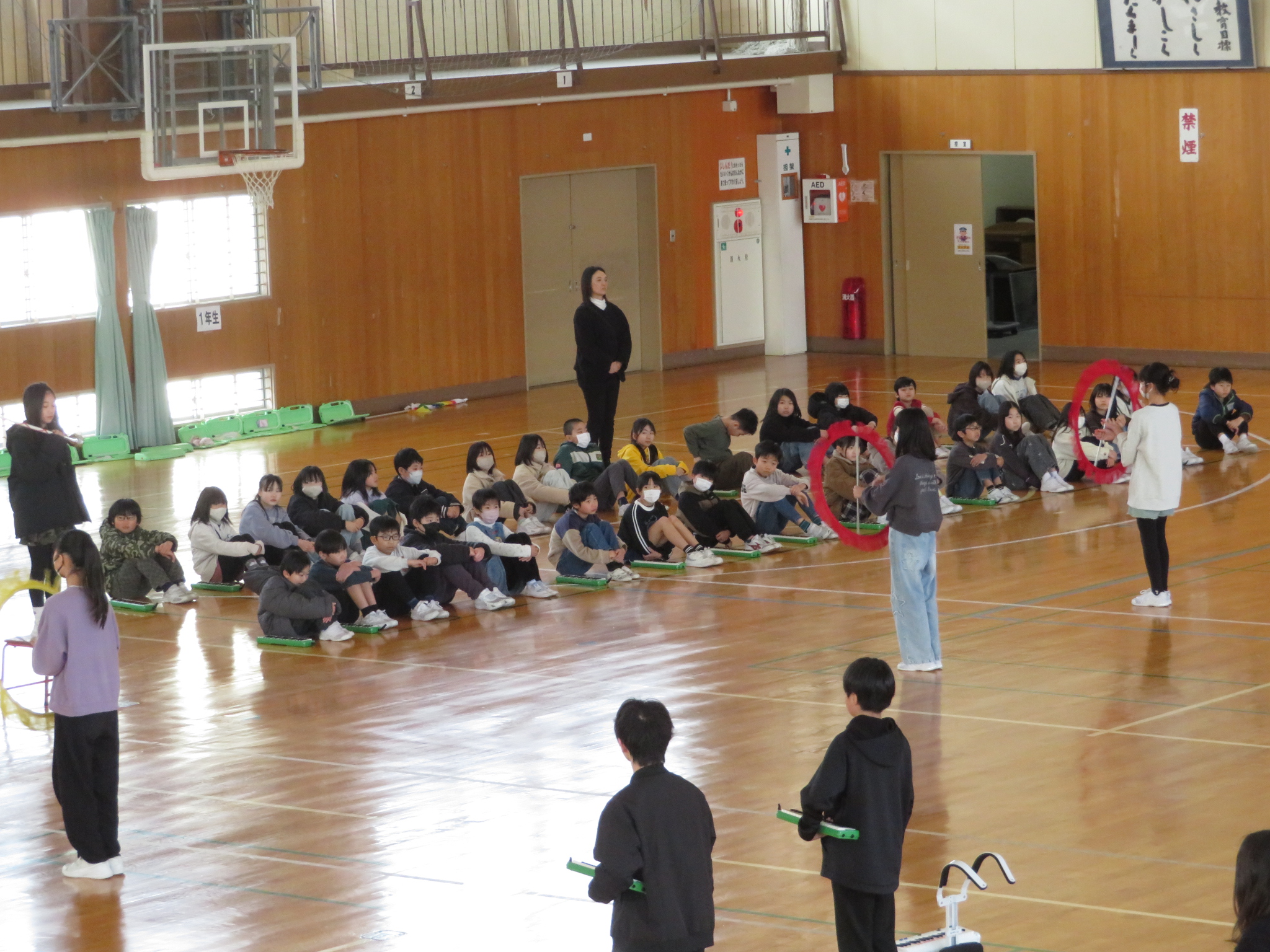 最初は、5・6年生による演奏。それを見る4年生です。