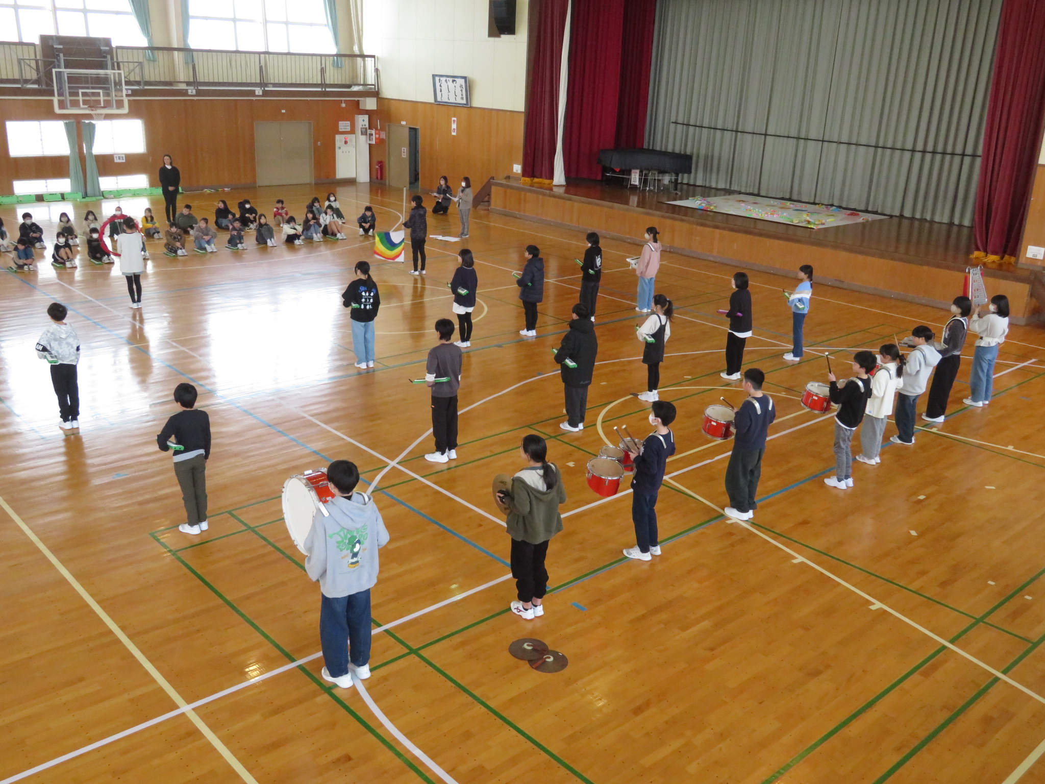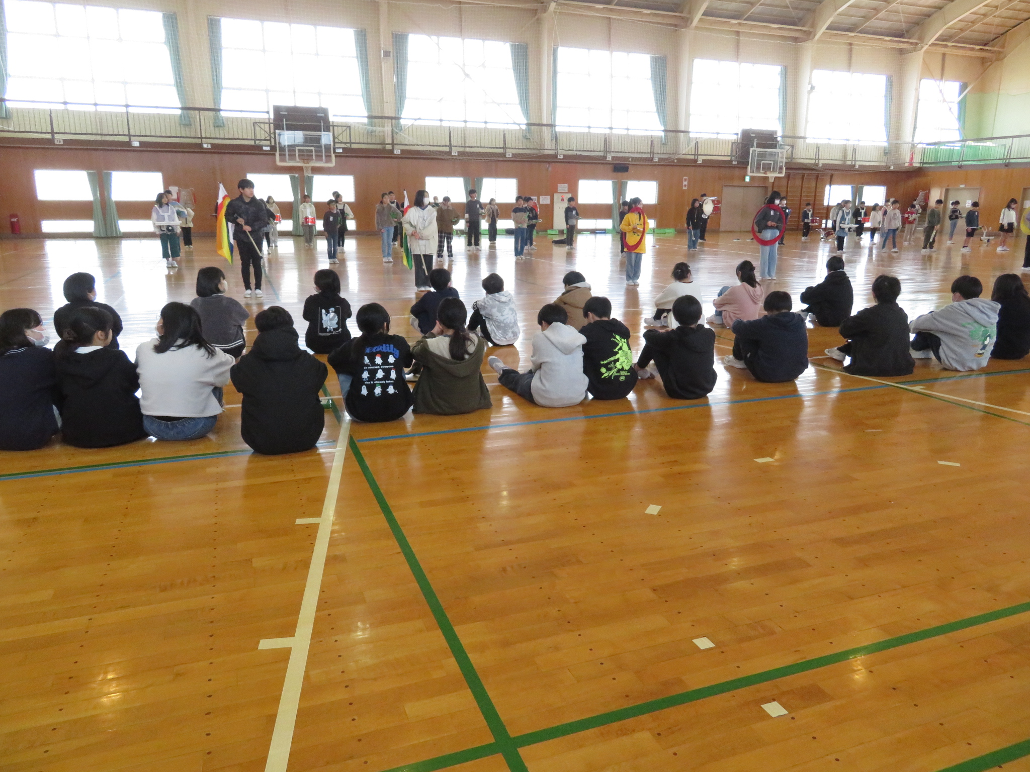 4・5年生による新しいマーチングメンバーの演奏です。それを見守る6年生です。