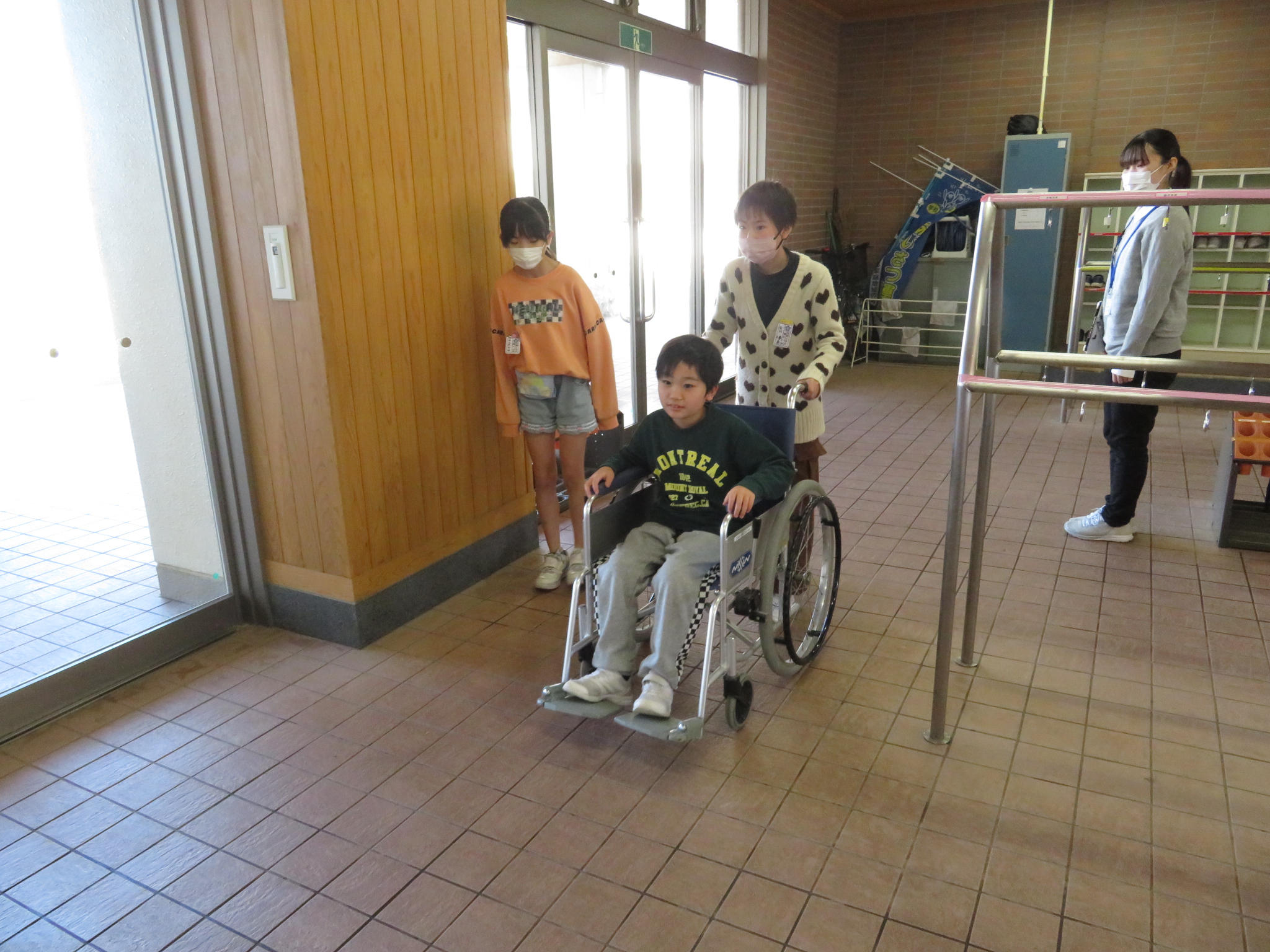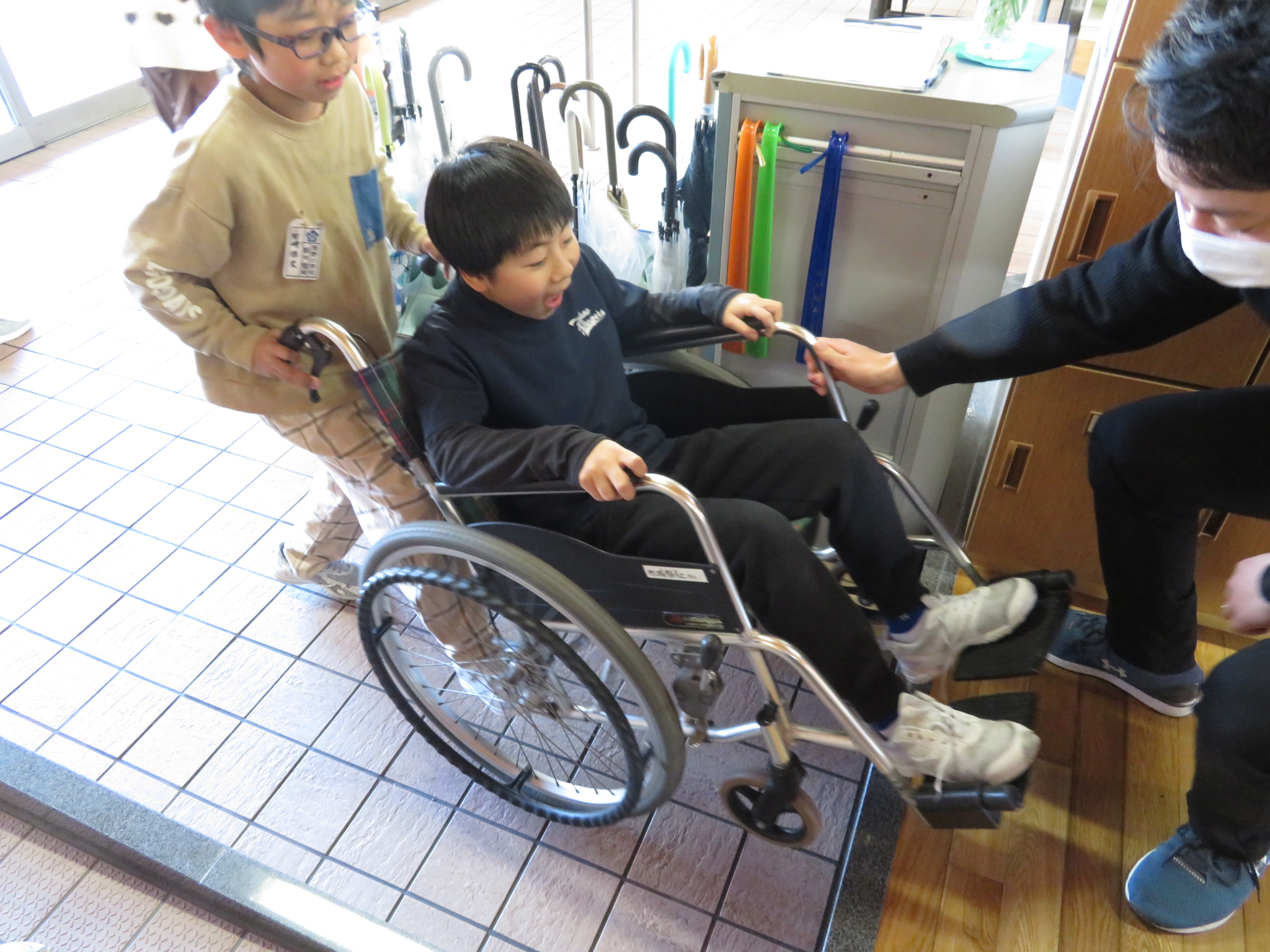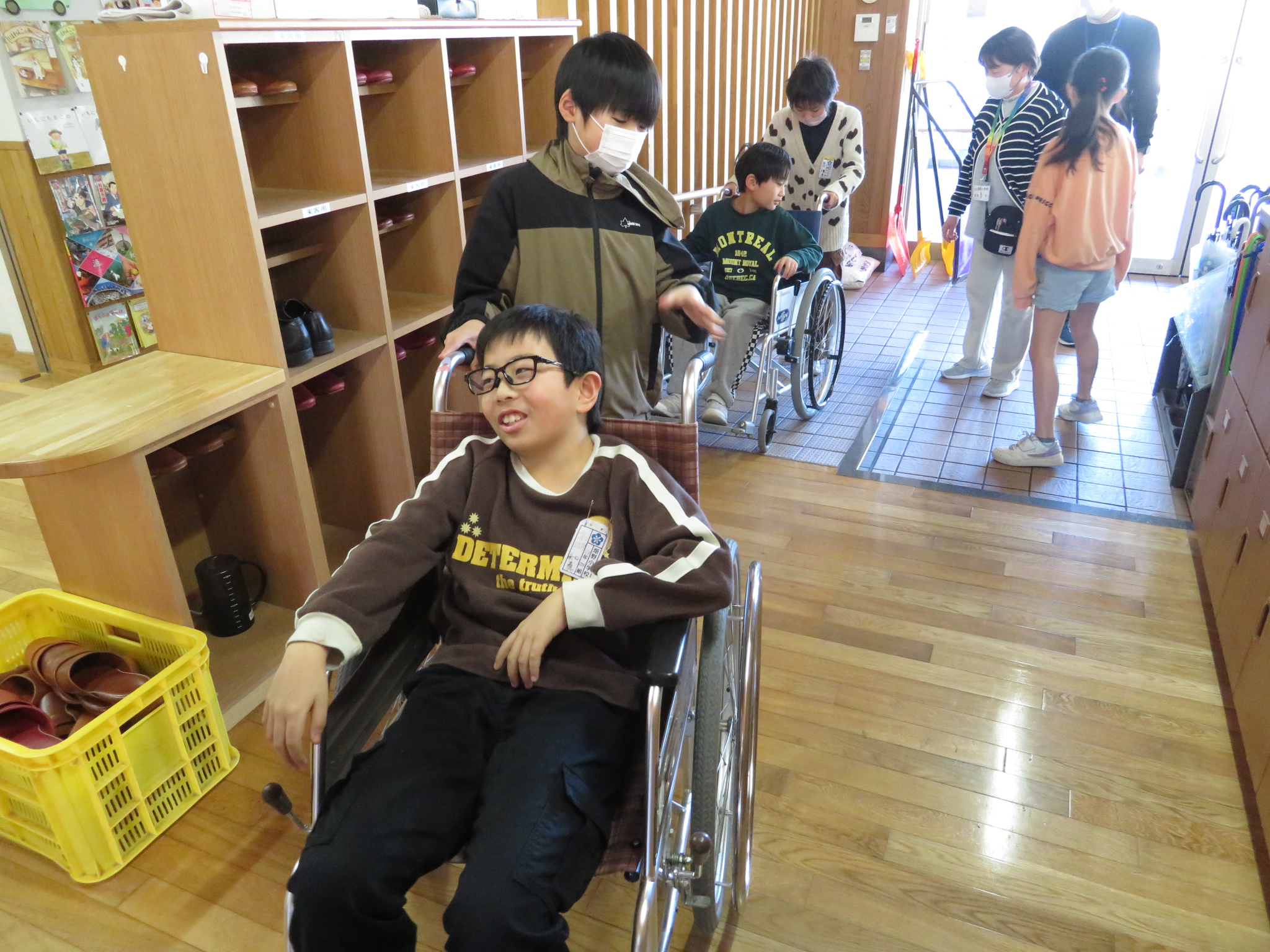 車いすに乗ったり介助したりして、どちらの気持ちも体験します。「乗っているとけっこう怖い」そうです。
