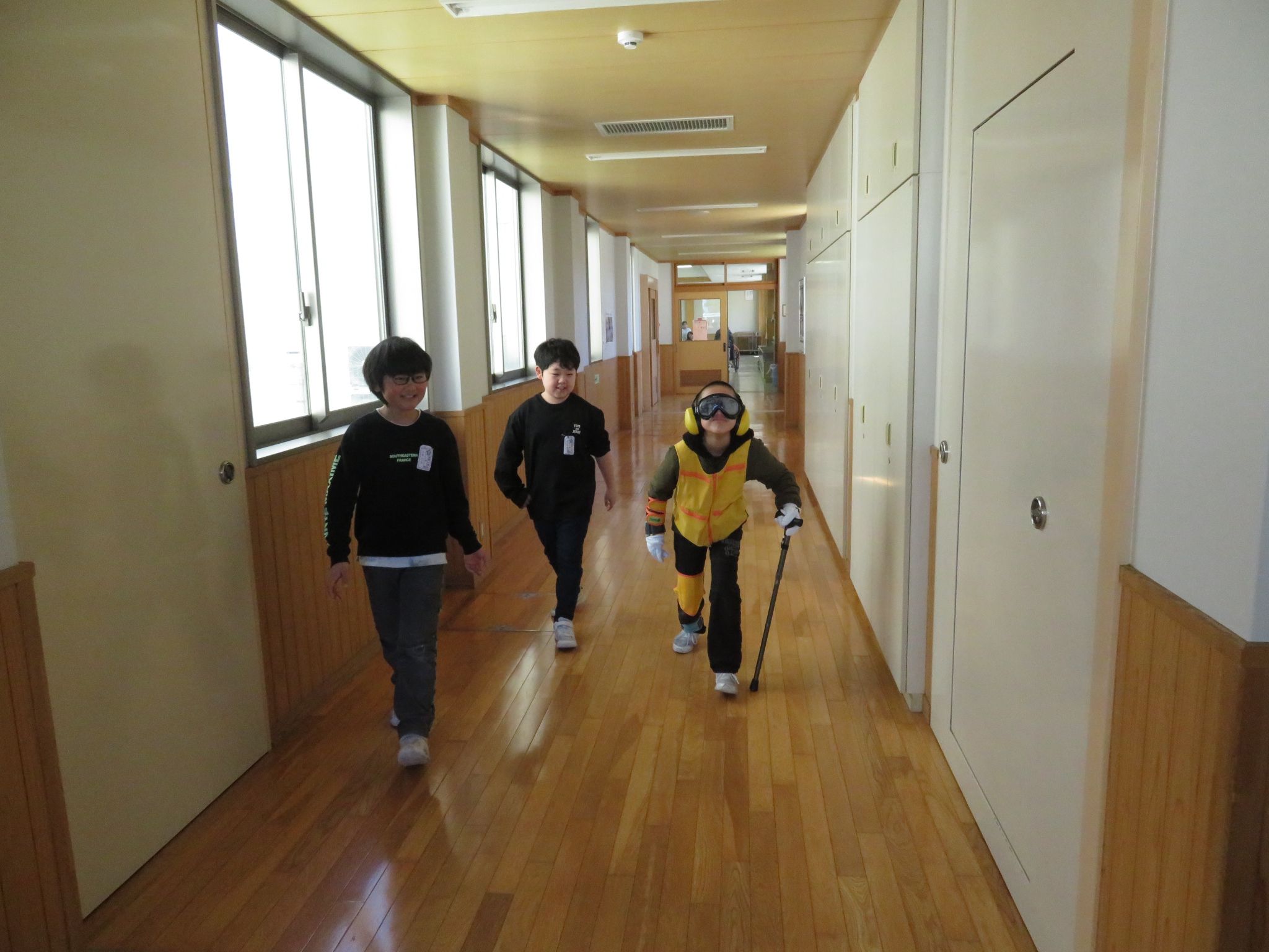 アイマスクを付けたり手足に重りを付けたりして、歩きにくさ、見えにくさを体験します。