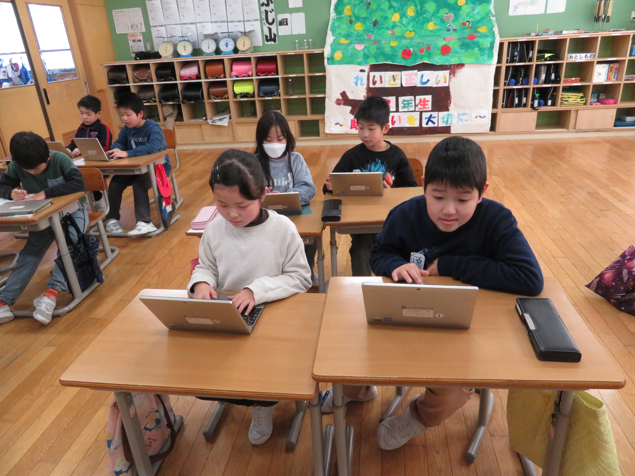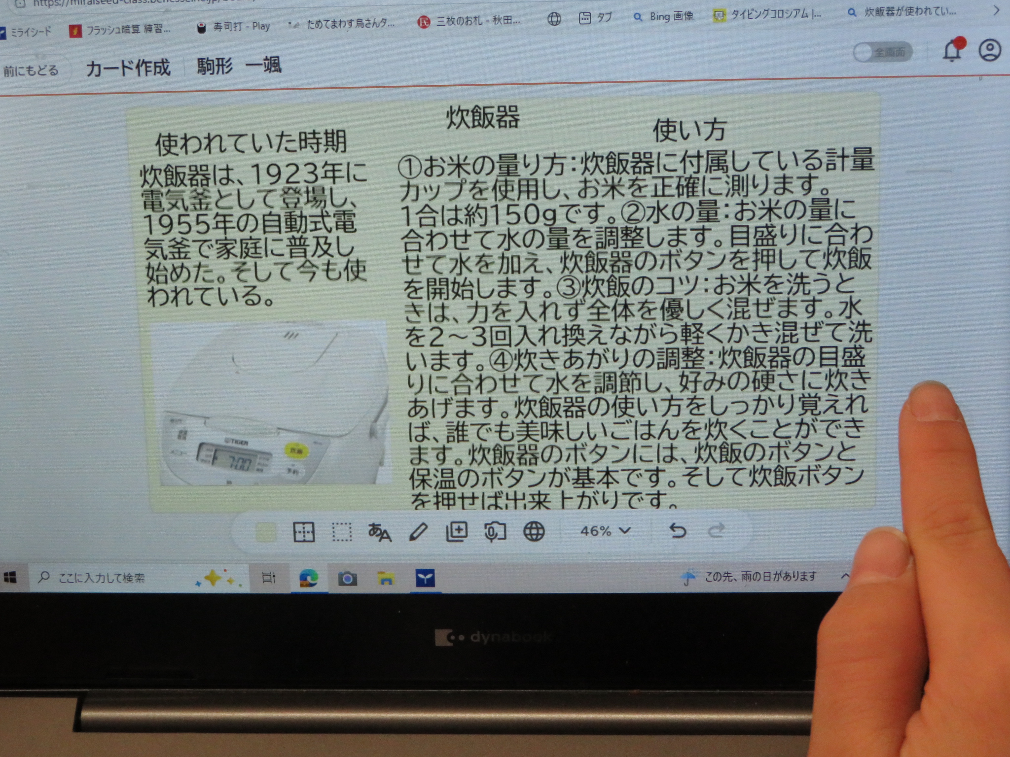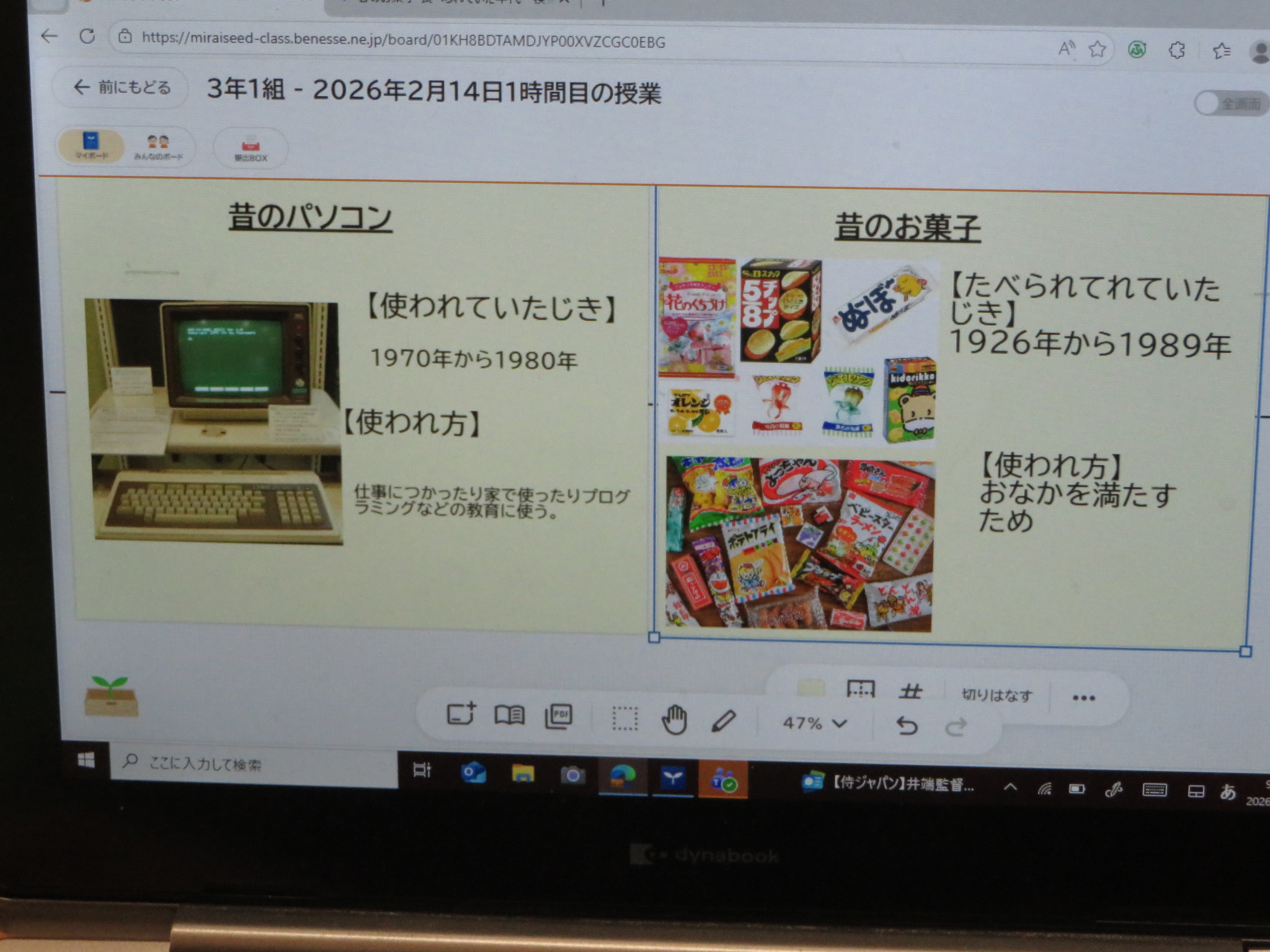 タブレットを使い、インターネットでそれぞれが調べたいものの「昔と今」をまとめます。