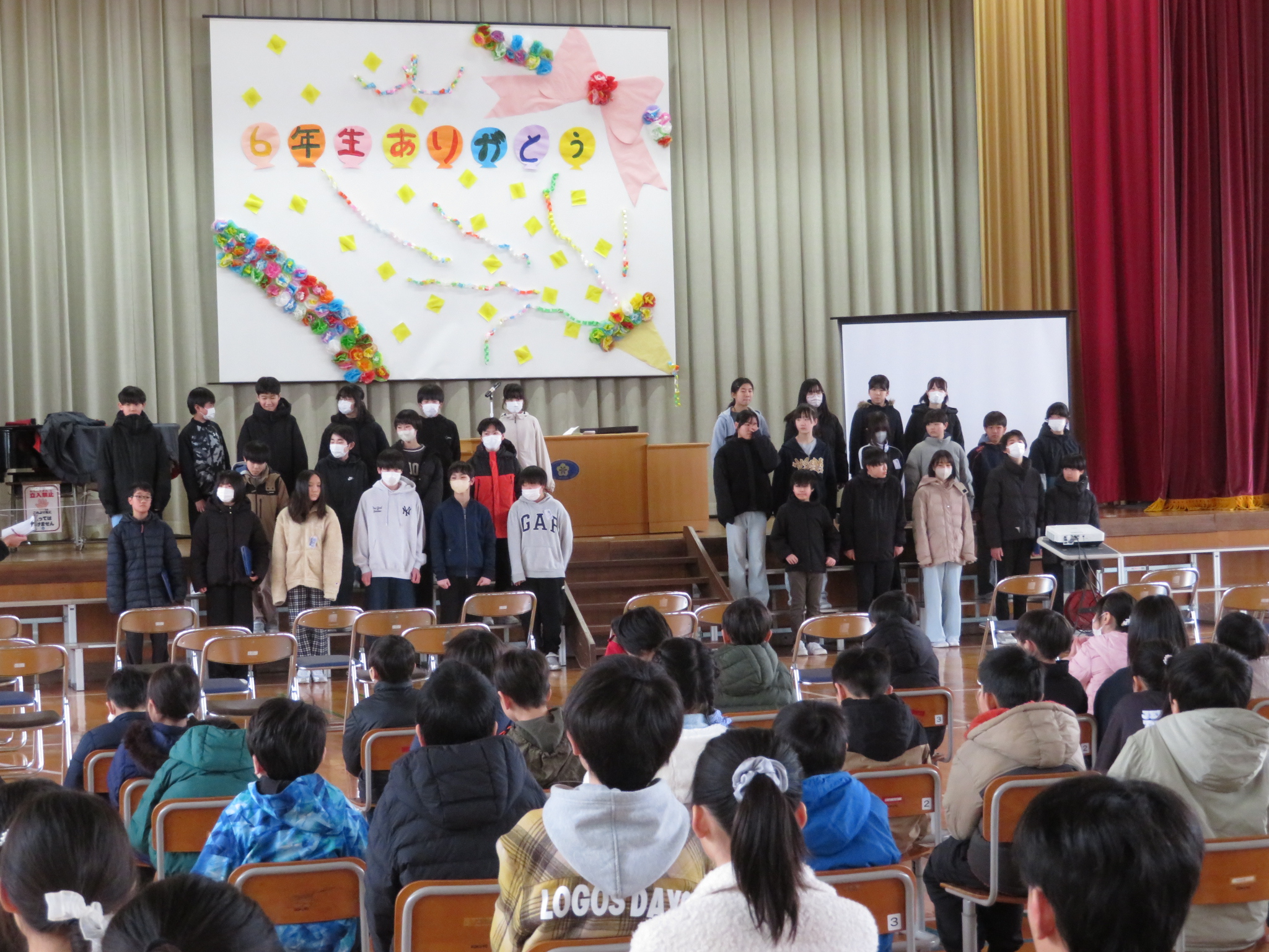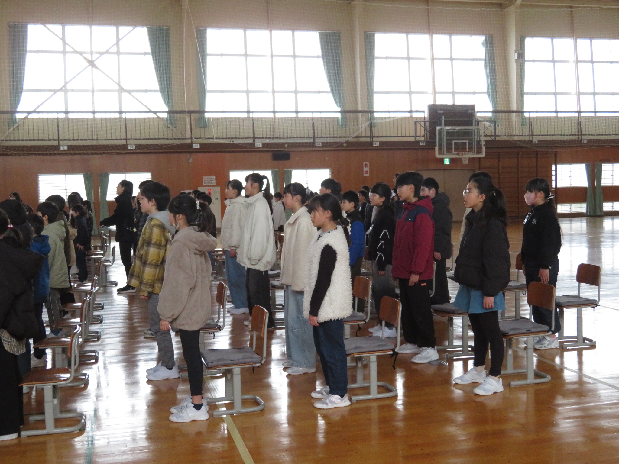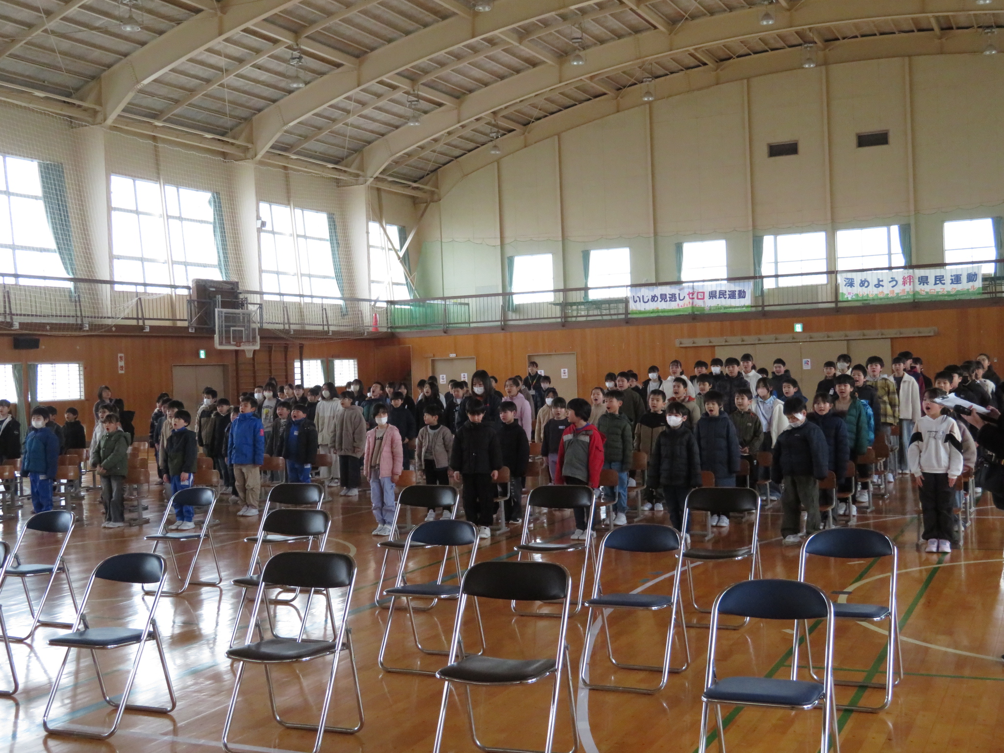 特に5年生の声の張りがよくて、気持ちがこもっています。寒くても、みんな背筋がピーンと伸びています。