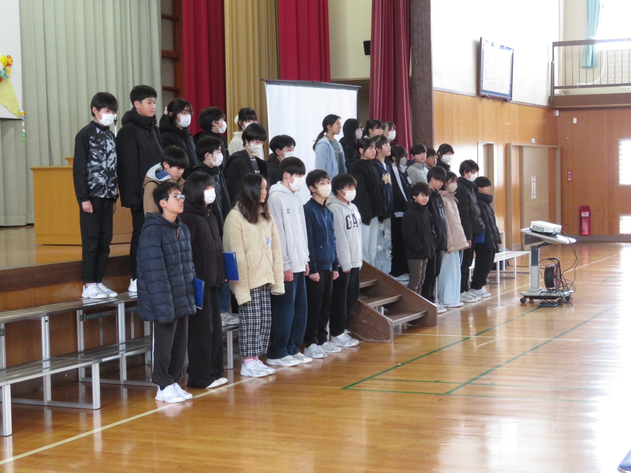 式の流れを通しながら、卒業式の練習をしました。「別れのことば」を卒業生と在校生がかけ合う場面です。