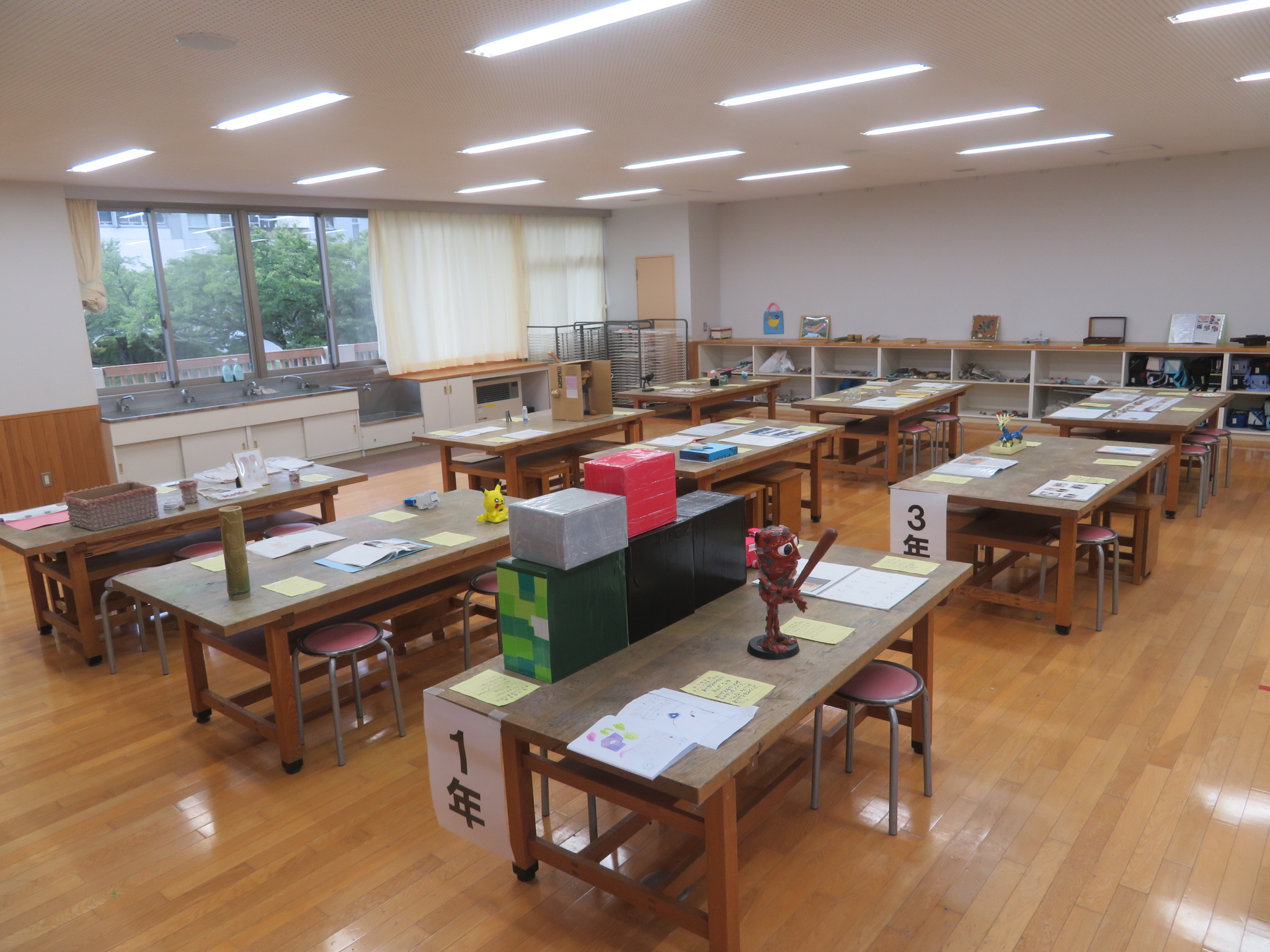 1~3年生は2階の図工室、4~6年生は3階の多目的ホールに展示してあります。