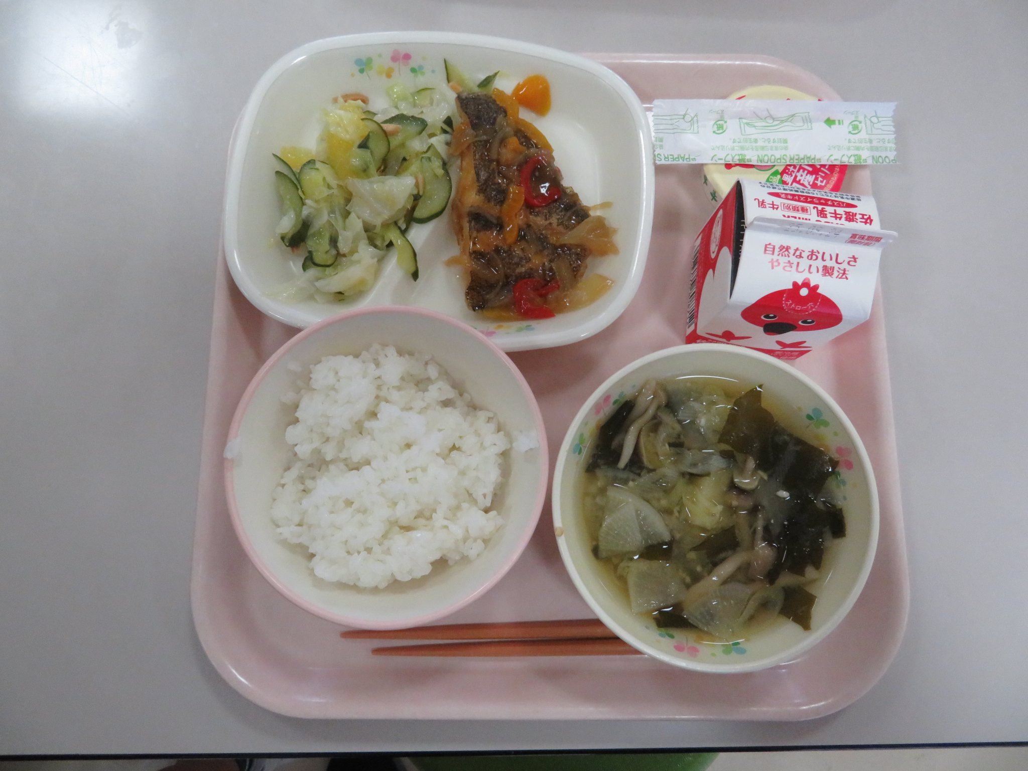 今日のメニューは、牛乳、ごはん、カレイの野菜あんかけ、甘夏サラダ、わかめの味噌汁、りんごゼリーでした。