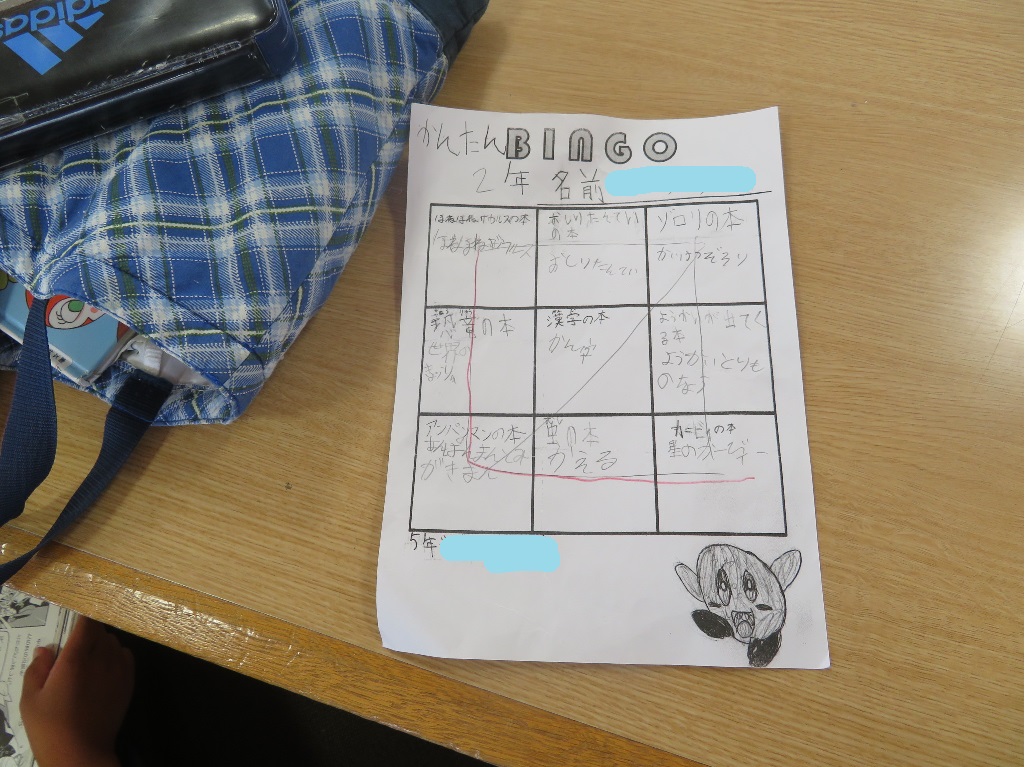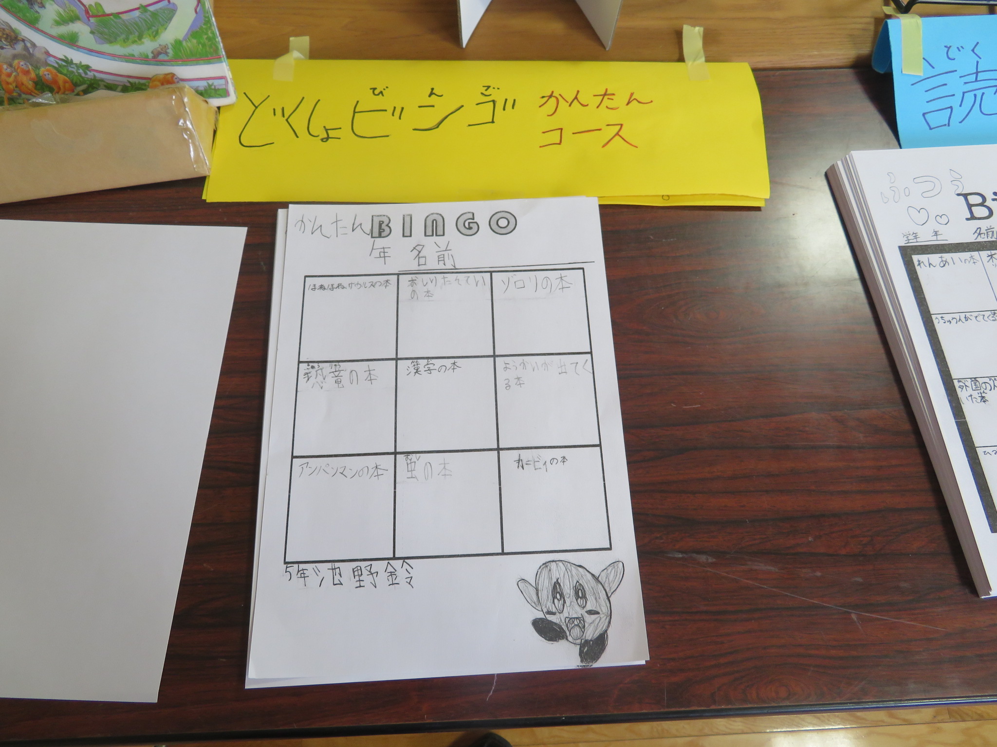 「読書ビンゴカード」がおかれています。多くの児童がビンゴカードに