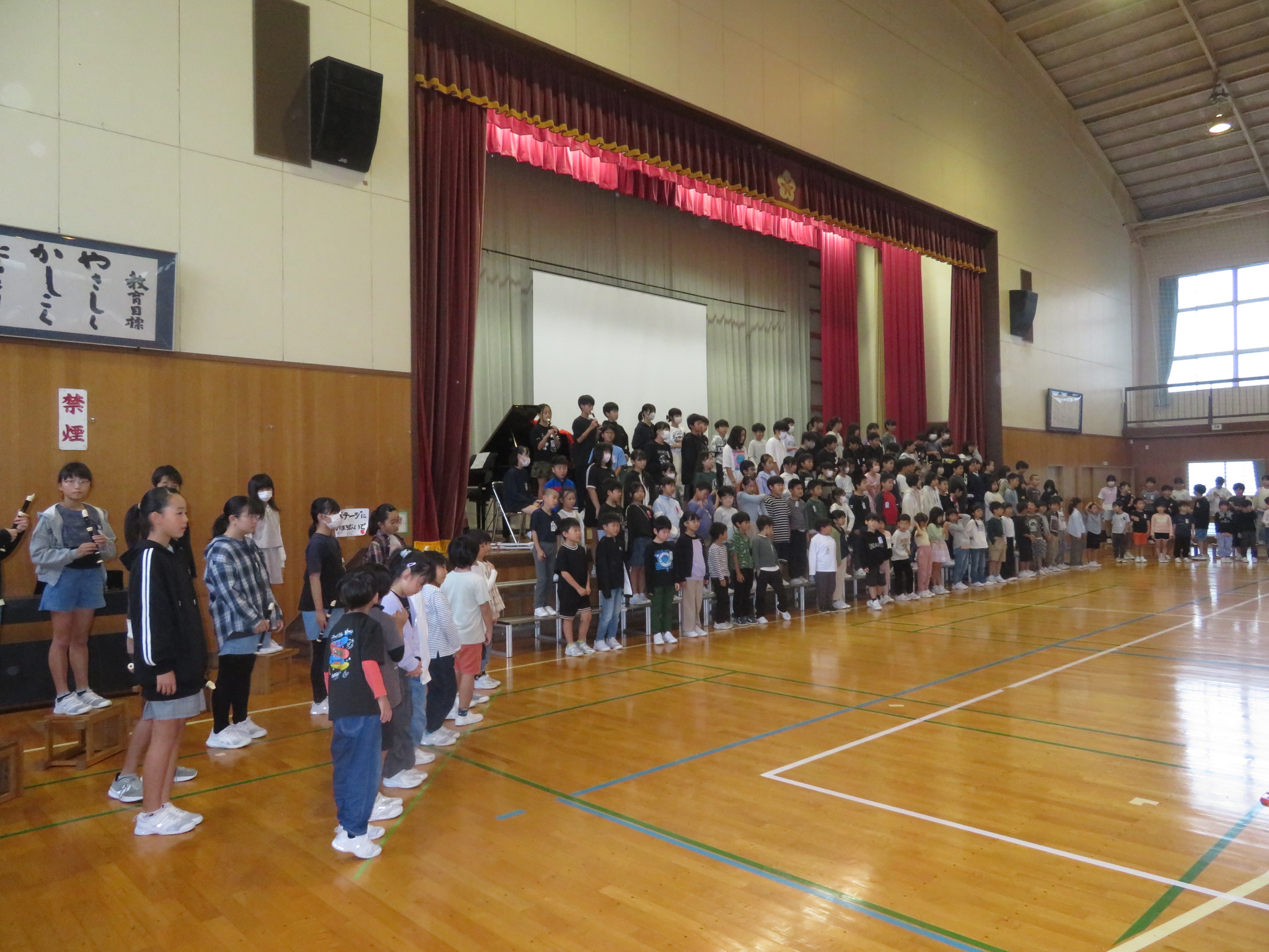 明日の学習発表会に向けて最後の練習をしました。写真は全校合唱の様子です。全校で歌う楽曲は「にじ」です。畑っ子全員で明るい希望を胸に、心を込めて歌います。その他にも各クラスでの学習の成果を一生懸命発表します。どうぞ、皆様、暖かいご声援と激励をお願いします。