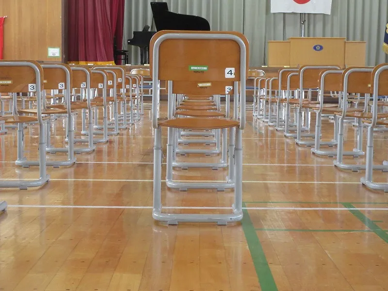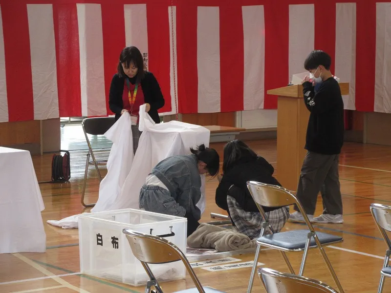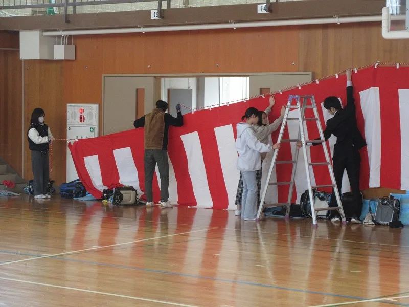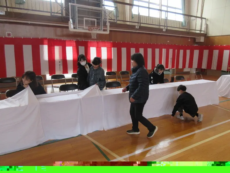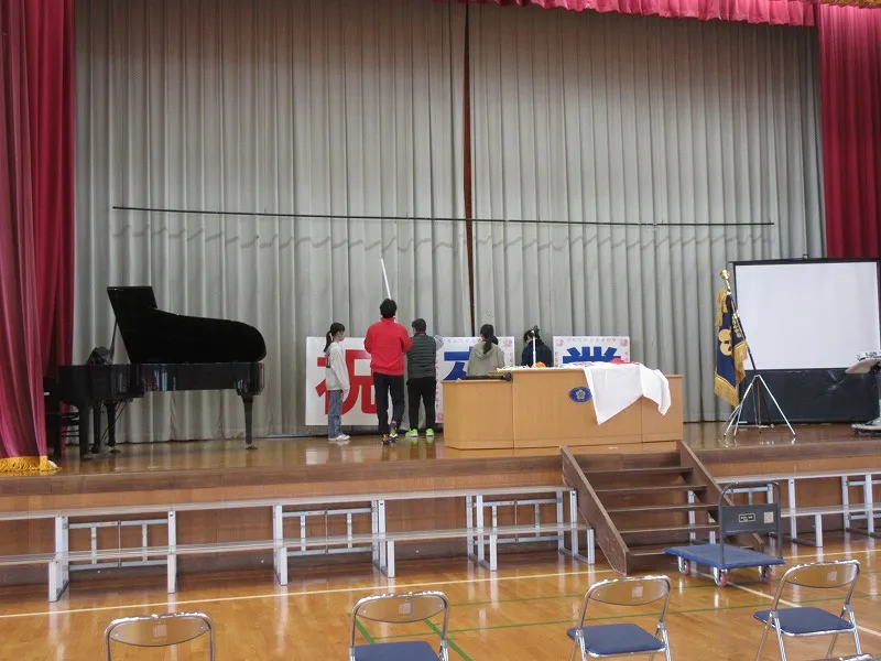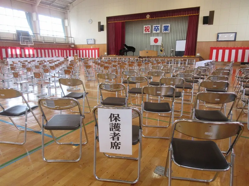 畑っ子5年生と先生方が,式場を整えてくれました。最後の一枚。椅子の真後ろから腰をかがめて,椅子の曲がりや座板のゆがみをキッチリとチェックしている写真です。この一枚が,5年生の「頑張り」の全てを物語っています。新リーダーにふさわしい立派な態度でした。ありがとう!畑っ子5年生!いや!畑っ子新6年生!!