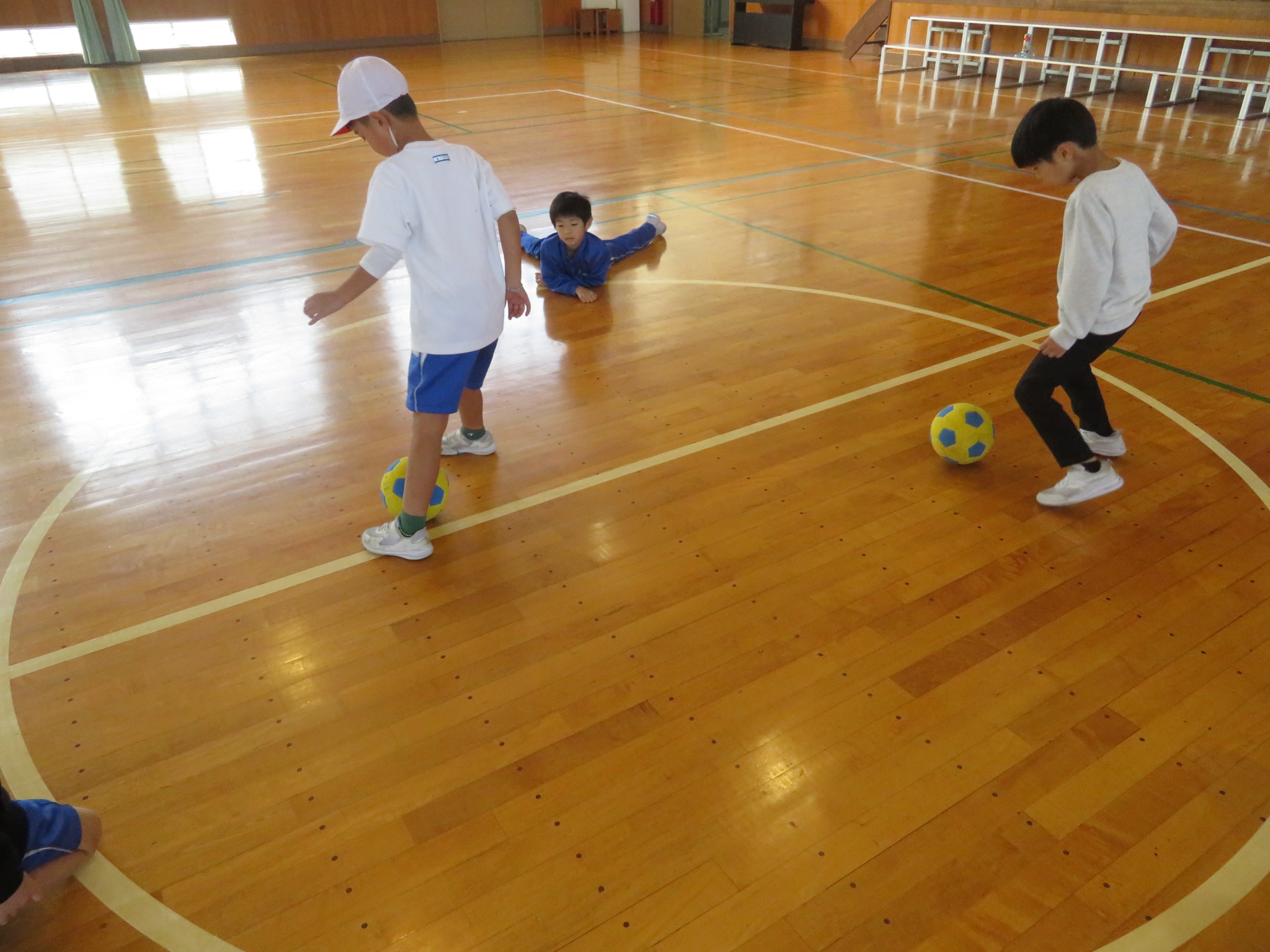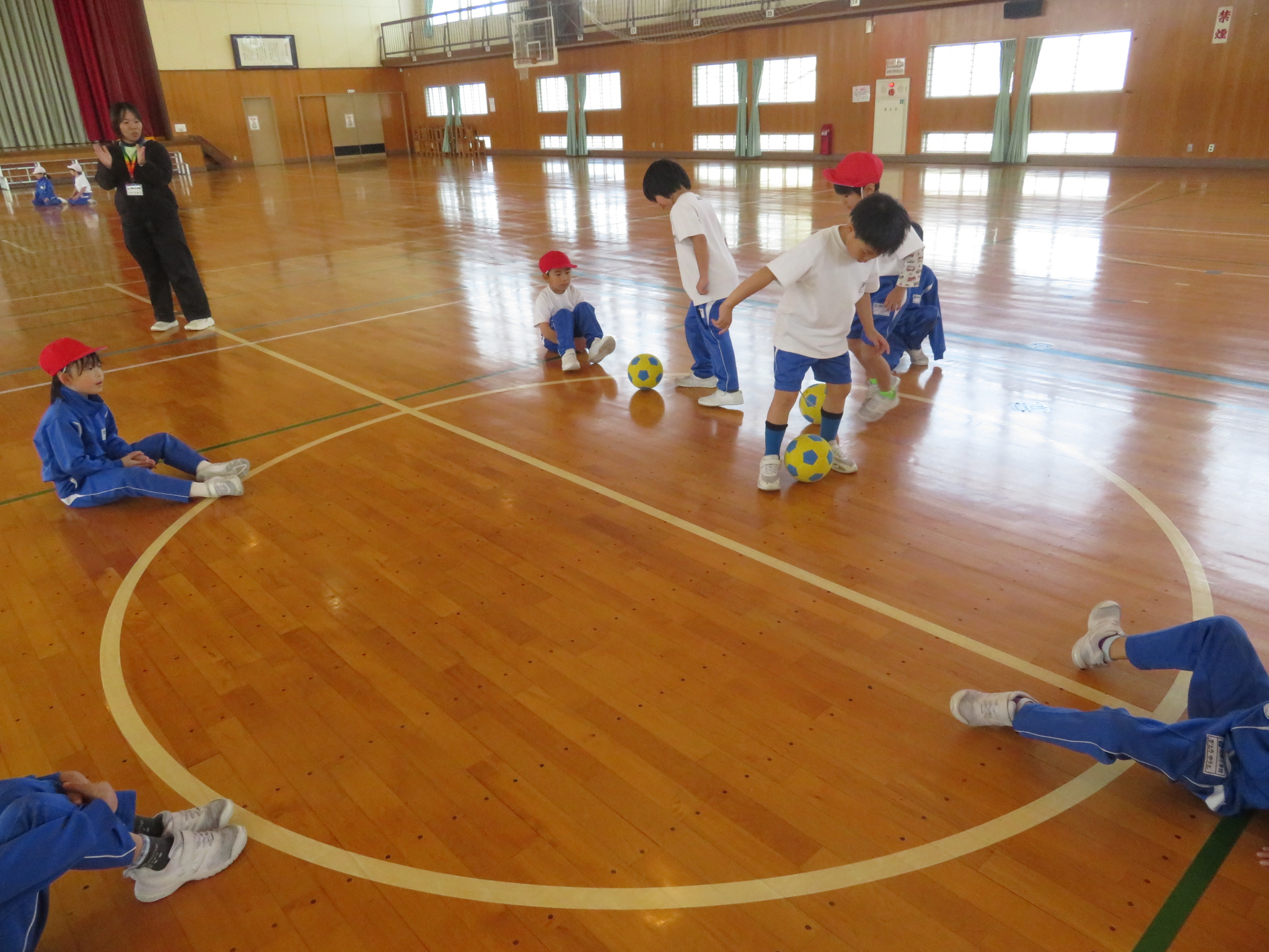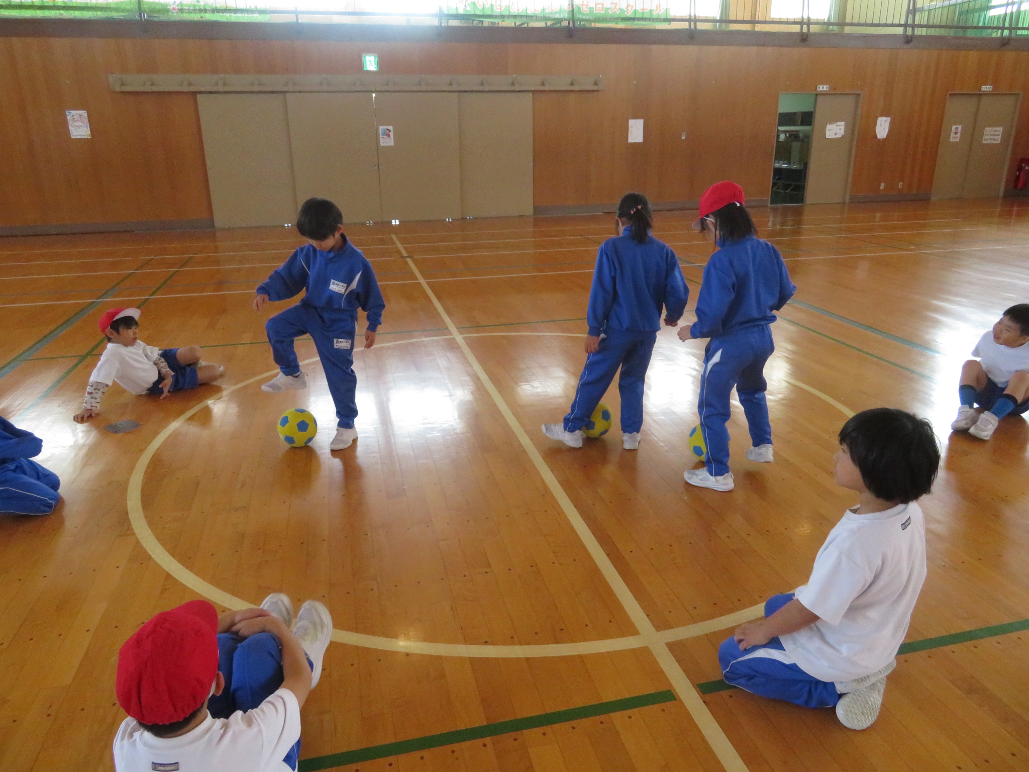 写真は太鼓がなっている間はサークルから出ないようにボールを蹴る練習で、