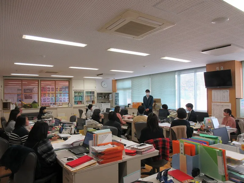 職員臨時集会を開き,畑野小学校最後の出勤日となった理科専科の先生とのお別れの会を行いました。