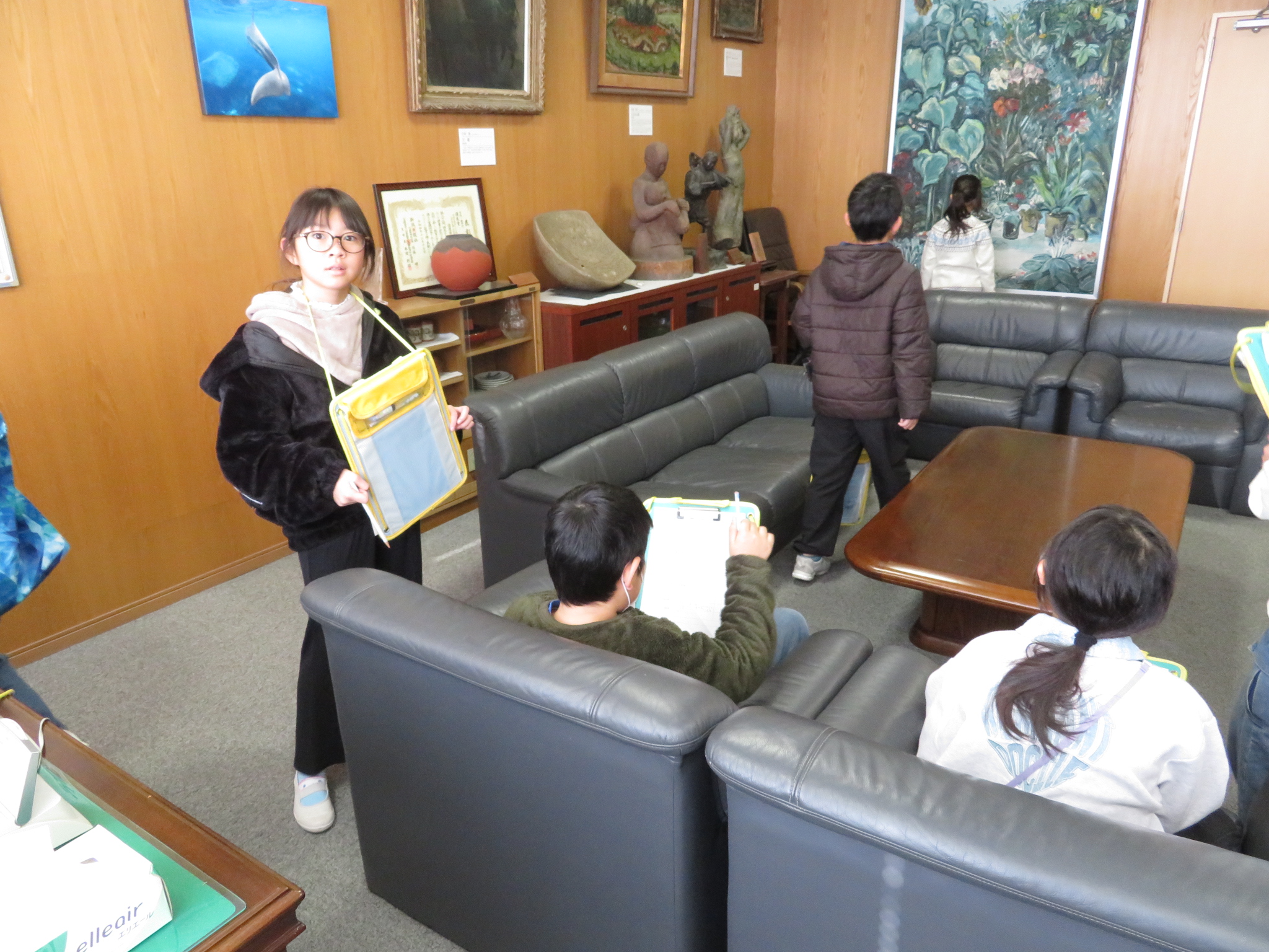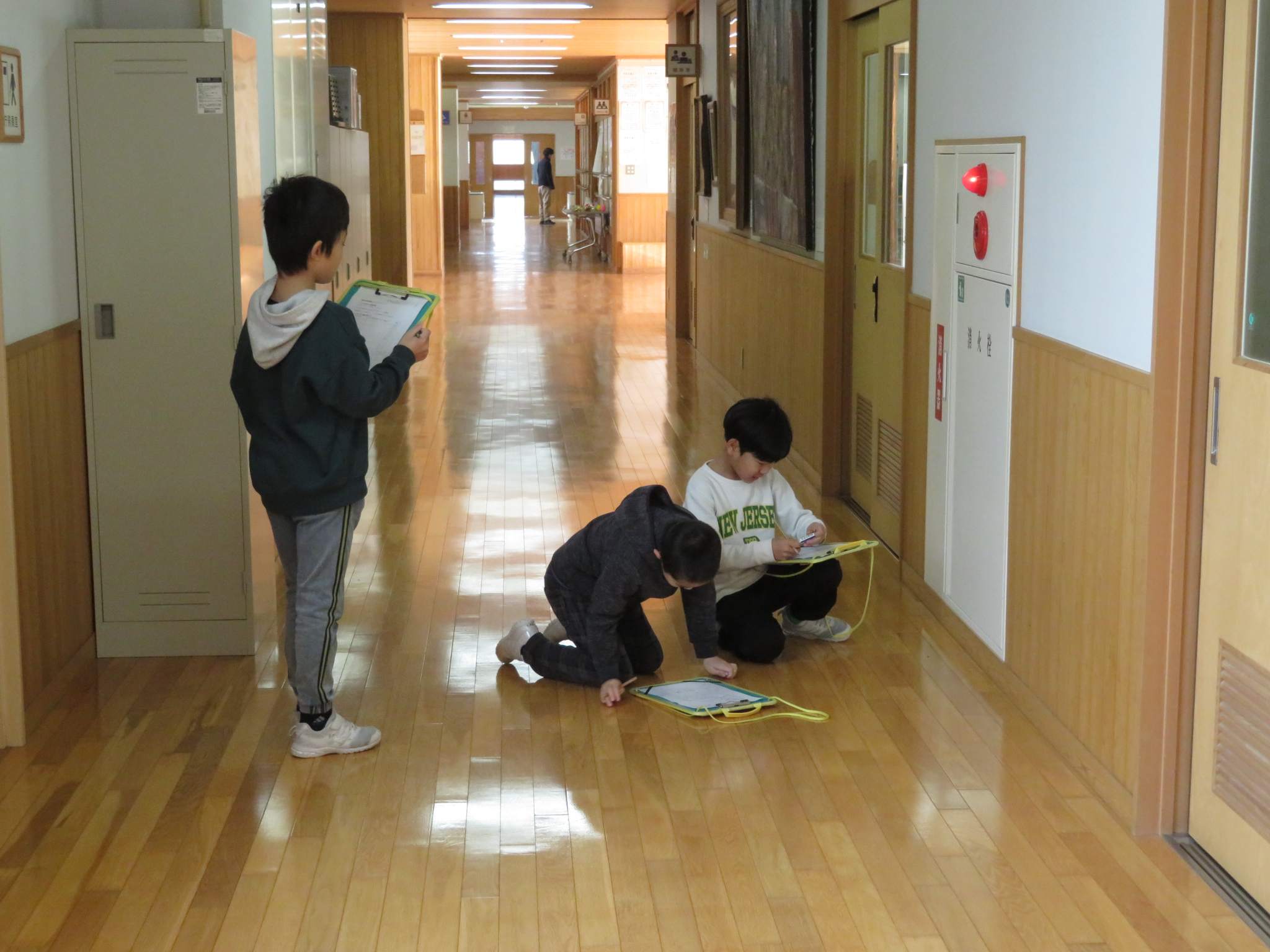 3年生が社会科の学習で、校舎内の消防設備を調べて回っていました。